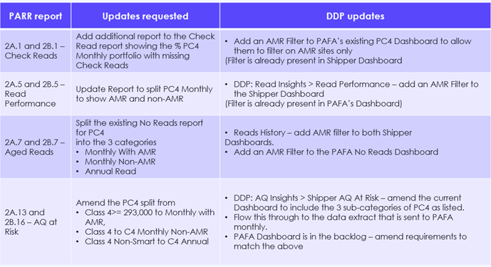 During the HPM workshops it was identified that a selection of the Class 4 Read performance PARR reports could be amended to help the PAC with the monitoring and improvement of Settlement impacts.
