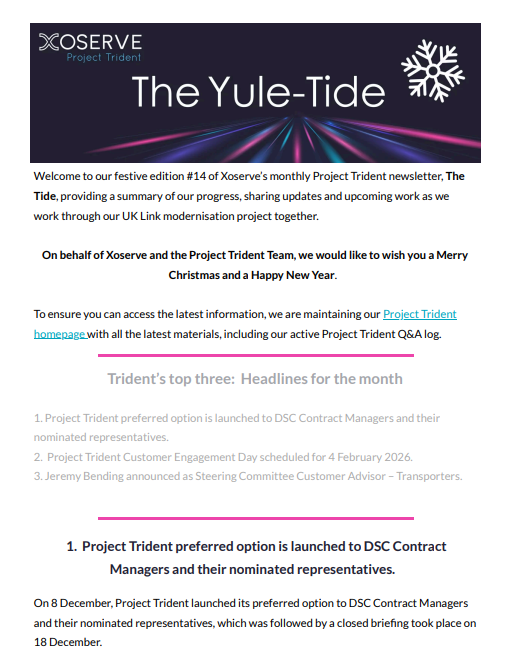 The Tide - Issue 14 - December 2025Welcome to our festive edition #14 of Xoserve’s monthly Project Trident newsletter, The Tide, providing a summary of our progress, sharing updates and upcoming work as we work through our UK Link modernisation project together.