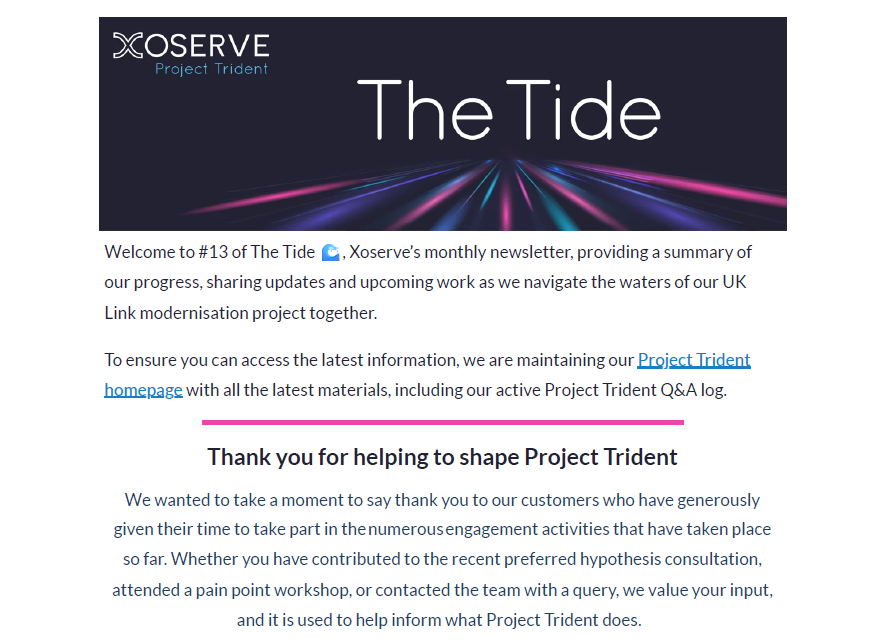 The Tide - Issue 13 - November 2025Welcome to #13 of The Tide, Xoserve’s monthly newsletter, providing a summary of our progress, sharing updates and upcoming work as we navigate the waters of our UK Link modernisation project together.