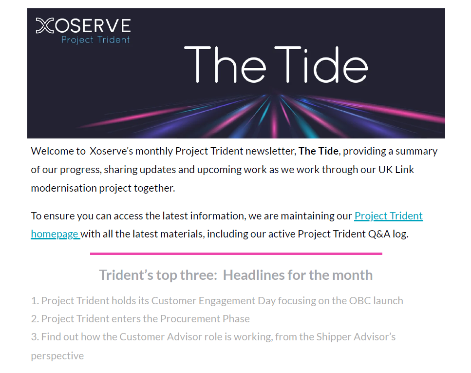 Project Trident refers to a significant project of work to modernise UK Link, the platform we use to connect the complex information, technology and communications systems that are essential to the successful competitive retail gas market in Britain.